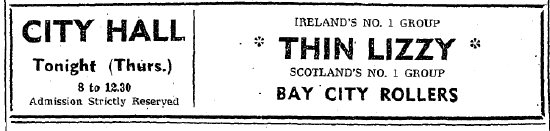 - Who’d have thought that Thin Lizzy and the Bay City Rollers would share a bill? Bay City Rollers didn’t really become big until 1974, but they were listed as Scotland’s Number 1 group.